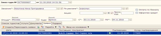 Рисунок 38 1 (Рисунок 38) - сроки поездки, поля «С» и «ПО», заполняются автоматически, исходя из данных указанных в «Заказе тура», при необходимости возможно изменить вручную. ВНИМАНИЕ!!! В одной услуге продажи ж/д билетов можно оформить билеты только в одну сторону, то сроки «С» и «ПО» заполняются одной датой. Если же ж/д билеты приобретаются «Туда и обратно», то в заказе должно быть оформлено две услуги: одна с датой поездки туда и другая с датой обратно! 2 (Рисунок 38) - в поля «Отправление» и «Прибытие» с помощью кнопки 3 (Рисунок 38) - в поле «Тип транспорта» по умолчанию стоит «авиа», необходимо обязательно изменить на «ж/д». 4 (Рисунок 38) - поле «Направление» по умолчанию стоит «в одну сторону». 5 (Рисунок 38) - в поле «Класс» по умолчанию стоит «Эконом», необходимости обязательно изменить на другую позицию из справочника «Типы классов обслуживания», например: купе. 6 (Рисунок 38) - позиция поставщик при определении «тип транспорта» «ж/д» выставляется автоматически «В.И.П. Сервис» с юридическим лицом «ВИП Сервис ж/д» 7 (Рисунок 38) - стоимость за ж/д билеты выставляется только «за персону». ВНИМАНИЕ!!! - ПРИ БРОНИРОВАНИИ БИЛЕТОВ У ПОСТАВЩИКА ВИП СЕРВИС НЕОБХОДИМО СТОИМОСТЬ УКАЗАННУЮ ПРИ БРОНИРОВАНИИ НА САЙТЕ «ВИП Сервиса» СТАВИТЬ В ПОЗИЦИЮ «7». - Эта же сумма является себестоимостью по этим билетам! - К этой сумме автоматически прибавляется 200 руб., которые являются нашей комиссией. При необходимости общую стоимость билетов можно изменить ТОЛЬКО в БОЛЬШУЮ сторону в позицию «8»! 8 (Рисунок 38) - в поле «Номер билета» в обязательном порядке необходимо внести номер бланка билета на каждую персону. ВНИМАНИЕ!!! После внесения Номера билета и сохранения заказа, Заявка Поставщику сформируется автоматически (Рисунок 38а)