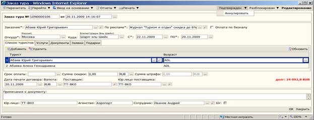 Рисунок 44 На закладках «Список туристов» и «Услуги» формы «Заказ тура» необходимо ввести всю нужную информацию о туре и нажать кнопку ВНИМАНИЕ!!! Без договора счета не выставляются!