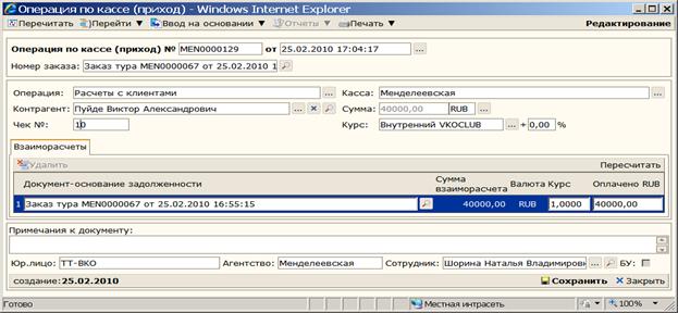 5.1.1. Оплата тура клиентом наличными В форме «Заказ тура» в меню: Открывается форма «Операция по кассе (приход)» (Рисунок 41).