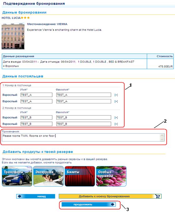 Шаг-2 «Данные постояльцев» введите имя, фамилию (данные должны совпадать с данными заграничного паспорта - в случае, если они будут неверные и потребуется замена фамилии, принимающая сторона может расценить как аннуляцию и выставить штрафные санкции вплоть до 100%) «Примечания» - пишем пожелания туристов на английском языке (пожелания можно писать ТОЛЬКО в момент бронирования) Нажмите кнопку «ПРОДОЛЖИТЬ», после введения ФИО и примечания.