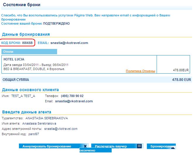 Для последующего доступа и управления заказом (модификация / аннуляция) необходимо запомнить КОД БРОНИ, указанный в подтверждении и выслать на электронный адрес: vkoonline@vkotravel.com