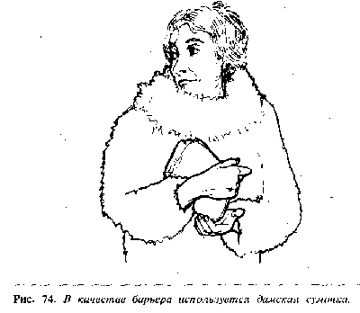 Замаскированные жесты, связанные со скрещиванием рук явля-ются очень утонченными, усовершенствованными жестами, к которым прибегают люди, постоянно находящиеся в центре внимания. К этой категории людей относятся политические деятели,, коммивояжеры, телевизионные комментаторы и другие, кто не хочет, чтобы их зрители заметили их неуверенность или нервозность. Для проделывания этого жеста рука движется поперек тела по направлению к другой руке, но вместо того, чтобы ухватиться за эту руку, она прикасается к сумочке, браслету, часам, запонкам или какому-нибудь другому предмету, находящемуся на противоположной руке или рядом с ней (рис.73). И снова образуется барьер и утверждается состояние безопасности. Когда были модными запонки, то часто можно было увидеть, как мужчины поправляли их в тот момент, как им приходилось на виду у всех проходить через комнату или танцевальный зал. Сейчас запонки вышли из моды и мужчины поправляют ремешок часов, проверяют содержимое своего портмоне, потирают руки, играют пуговицей на манжете или используют любой другой предлог, позволяющий им держать руки поперек тела.