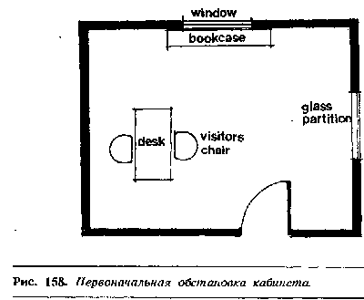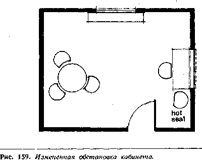 Некоторые вещи, продуманно распределенные по территории кабинета, могут невербально повысить статус и авторитет его владельца. Рассмотрим некоторые примеры: Все, что вам требуется для повышения вашего статуса и авторитета, это немного поразмыслить над тем, какую невербальную информацию передает обстановка вашего кабинета или дома. К сожалению, большинство кабинетов руководителей обставлены так, как показано на рис. 158, и редко кто задумывается над теми негативными невербальными сигналами, которые невольно передаются посетителям. Мы предлагаем вам внимательно осмотреть обстановку вашего кабинета и, используя полученную информацию, сделать все необходимые изменения к лучшему.