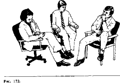 Рисунок 174. Человек слева демонстрирует превосходный букет жестов, передающих доверие, открытость и честность. Это протянутые ладони, выдвинутая вперед нога, поднятая голова, расстегнутый пиджак, расставленные руки и ноги. Он наклоняется вперед и улыбается. К несчастью, его позиция не находит отклика у присутствующих. Женщина сидит глубоко откинувшись на спинку стула и перекинув ногу за ногу (оборонная позиция), она использует правую руку как частичный барьер (оборонная поза). Ее стиснутые кулаки свидетельствуют о враждебном отношении. Голова наклонена вперед, и женщина прибегает еще к жесту критической оценки (рука под щекой). Мужчина в середине использует шпилеобразный жест, указывающий, что он чувствует себя уверенно и выше других. Сидит он, положив ногу на колено другой ноги, демонстрируя свое критическое отношение. Общая поза - негативная, т.к. он сидит, откинувшись назад со склоненной головой.