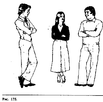 Эти три человека показаны в рамках обычной ситуации, складывающейся на любой вечеринке. Здесь можно проследить, как применяются типичные защитные и агрессивные жесты, а также жесты ухаживания. Рисунок 175. Все двое стоят со сложенными на груди руками, а двое скрестили и ноги (оборонительная поза). Туловища всех троих не ориентированы навстречу друг другу, - все говорит о том, что они встретились впервые. Человек справа очень заинтересован этой женщиной, что видно из того, как он развернул свою правую ногу носком в ее сторону и смотрит на нее искоса. Взгляд его сочетается с поднятыми бровями (интерес) и улыбкой, кроме того корпус его тела слегка наклонен в сторону.женщины.