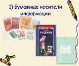 Одним из самых распространенных носителей информации является бумага. В школе мы записываем информацию в тетради, теоретический материал изучаем по учебникам, при разработке доклада, реферата или другого сообщения необходимые сведения мы находим в других источниках (книгах, энциклопедиях, словарях и т.д)(рис.5), которые в свою очередь являются бумажными носителями информации