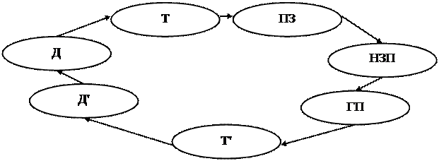 где Д – денежные средства, имеющиеся у предприятия на момент его создания или полученные в результате реализации продукции (работ, услуг); Т – товарно-материальные ценности, приобретенные предприятием и необходимые для начала (продолжения) производственного процесса; ПЗ – производственные запасы, т.е. товарно-материальные ценности, находящиеся на складах предприятия; НЗП – незавершенное производство; ГП – готовая продукция; Т' – готовая продукция предприятия (товары, работы, услуги), выраженная в товарной форме, т.е. продукция, на которую уже есть покупатель; Д' – денежные средства, поступившие в качестве оплаты за продукцию на расчетный счет предприятия.