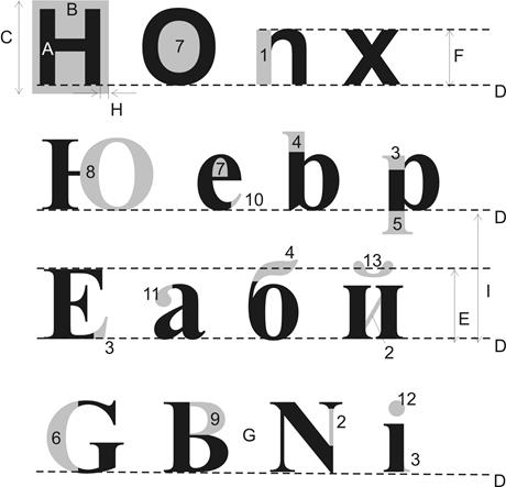 Рис. 1. Анатомия буквы и ее элементы А — очко литеры (Character); В — кегельная площадка (Em-Square); С — кегль (Size); D — линия шрифта (Baseline); Е — высота (рост) прописного знака (Cap-height); F — высота (рост) строчного знака (x-height); С — межбуквенный просвет (Letterspace); Н — полуапрош (Side bearing); I— интерлиньяж (Linespace). 1 — основной штрих (Stem); 2 — соединительный штрих (Hairline); 3 — засечка, сериф (Serif); 4 — верхний выносной элемент (Ascender); 5 — нижний выносной элемент (Descender); 6 — наплыв (Stress); 7 — внутрибуквенный просвет (Counter); 8 — овал (Oval); 9 — полуовал (Bowl); 10 — концевой элемент (Terminal); 11 — каплевидный элемент (Ball); 12 — точка (Dot); 13 — диакритический знак, акцент (Accent).