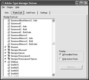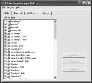 Рис. 5. Главное окно программы Оно содержит список шрифтов и наборов шрифтов (Sets). Набор установленных шрифтов обозначается пиктограммой папки с литерой «A»; PostScript-шрифты обозначаются вензелем из букв «Р» и «s»; TrueType-шрифты обозначаются вензелем из двух «Т». Слева от каждого шрифта и набора шрифтов располагается флажок, галочка в котором соответствует активному шрифту, ее отсутствие — неактивному. Помимо панели «Sets» в диалоговом окне ATM доступно еще три папки: Font List (Список шрифтов), Add Fonts (Добавление шрифтов) и Settings (Установки). Список шрифтов (рис. 6) содержит только перечень шрифтов (всех или только активных — в зависимости от состояния переключателя в правой части диалогового окна). Метка слева от имени шрифта означает активное его состояние, однако активизировать или деактивизировать шрифт из этой панели нельзя.
