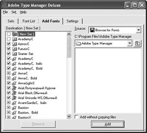 В панелях Sets и Fonts List имеется кнопка «Remove», предназначенная для удаления шрифтов из базы данных ATM. To же действие может быть вызвано через меню правой клавиши мыши. Запрос на удаление формируется для всех шрифтов, отмеченных в списке; если в списке отмечен набор шрифтов, вместе с ним удаляются все шрифты, в него входящие. Для добавления новых PostScript-шрифтов в ATM служит специальная панель Add Fonts. При ее активизации (рис.) в в левой части окна появляется фиктивный набор с именем New Set (новый набор). Если необходимо расширить существующий набор, то следует выделить один из наборов.
