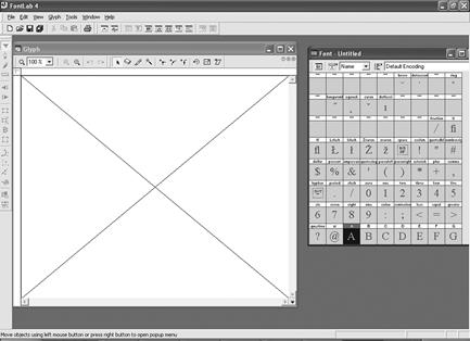 Рис. 10. Главное окно программы В левой части экрана находится большое окно с двумя перекрещивающимися линиями. Это окно редактирования, в котором производятся все действия, связанные с изменением контуров символов.