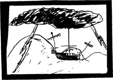 Есть много способов использовать эту фантазию. Мне кажется наиболее эффективным просто попросить ребенка (после упражнений по медитации и дыханию) с закрытыми глазами представить себе, что он — это маленькая лодочка во время сильного шторма. Я говорю о волнах, ветре и борьбе. Я прошу ребенка, чтобы он был лодкой, чтобы он ощущал себя лодкой, чувствовал, что происходит с ним сейчас, что будет потом. Затем я прошу его нарисовать на картинке самого себя как лодку во время шторма (рис. 8). При этом неизмен- но возникает обширный материал, касающийся места ребенка в его мире и того, как он справляется с внешним миром.