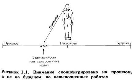 6. Начните работать на будущее, а не на прошлое. На рисунке 1. 1 изображено, о чем вы думаете, когда у вас много дел, не выполненных в прошлом, или старых задач, которые нужно решить. Иксы (ххх) символизируют все задачи, которые должны быть решены. Ваше внимание занято задачами из прошлого. Психологи утверждают, что показателем духовного здоровья личности является сравнительная степень концентрации внимания на задачах прошлого, настоящего и будущего. Работа с задачами настоящего, обращенными в будущее, рассматривается как показатель духовного здоровья. Неудивительно, что мы буквально сходим с ума, когда над нами висит множество недоделок. Когда ваше внимание обращено в прошлое, вы сосредоточиваетесь на том, что могло бы произойти, на упущенных благоприятных возможностях. Помните, что все, что устремляет вас в будущее, здоровее того, что тянет в прошлое.