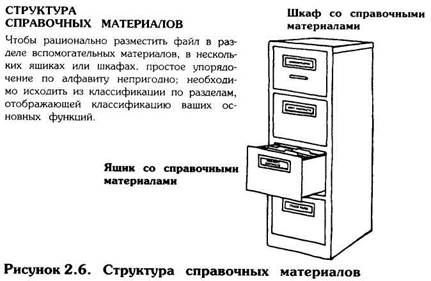 • Не стремитесь ли вы хранить информацию «на всякий случай»? • Не слишком ли разбухли ваши вспомогательные папки? • Принимая решение сохранить что-либо или уничтожить, последуйте совету Стефани Уинстон из ее книги «Getting Organized» («Как организовать работу») (Warner Books, 1991) и спросите себя: «Если эти данные мне снова понадобятся, где я смогу их найти?» • Может ли кто-нибудь еще в вашей организации предоставить вам информацию? Не дублируйте файлы коллег, если только вам не придется пользоваться этой информацией часто. • Не нужно ли вам объединить свои усилия с кем-нибудь из коллег, чтобы та или иная информация хранилась у него? • Не нужно ли вам посоветоваться, как систематизировать ваши справочные материалы, с тем, кто тоже ими пользуется? Следующие предложения помогут вам структурировать ваши вспомогательные файлы (см. рис. 2. 6).