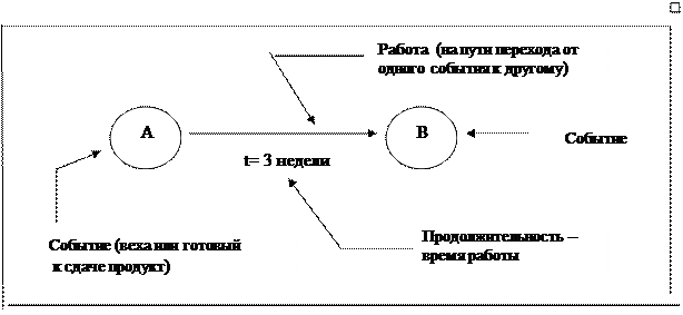 Общее время для выполнения комплекса работ поставленной задачи определяют следующие факторы: Продолжительность - время, которое необходимо для выполнения каждой отдельной работы. Последовательность - порядок выполнения работ. Если проект совсем небольшой, то еще можно держать всю информацию о работах в голове. Но когда работ больше двадцати, причем многие выполняются одновременно, нужна особая методика планирования. Сетевой график — это последовательная схема, отражающая порядок выполнения работ проекта. Он позволит Вам провести своего рода тестирование: продумать различные стратегические подходы, прежде чем начать работы. Сетевой график включает три элемента. ● Событие — значительное происшествие в ходе выполнения проекта; иногда называемое узловым событием или вехой. Оно не имеет протяженности во времени и не потребляет ресурсов. Это мгновенная точка отсчета в вашем проекте (как указательный столб на дороге), которая характеризует начало или конец работы или группы работ. Примеры событий: " Отчет утвержден" или " Начало проектирования". ● Работа — действия, которые выполняются, чтобы перейти от одного события вашего проекта к другому. Она занимает время и потребляет ресурсы. Примеры описания работ: " Разработать формат отчета" или " Сформулировать требования к новому продукту". ● Продолжительность — календарное время, требуемое на выполнение работы. Оно также называется периодом или временем работы. Продолжительность работы зависит от ее трудоемкости, количества исполнителей (с учетом их работоспособности), производительности используемого оборудования (например, вычислительная мощность компьютера) и доступности требуемых ресурсов. Сетевой график имеет две основные формы представления: ~ События-работы. Кружочками обозначаются события, а стрелками - работы. Эта форма считается классической, или традиционной. ~ Работы-связи. Наименования работ вписываются в прямоугольники, а их связи обозначаются стрелками. Оба формата взаимозаменяемы, т.е. все, что можно представить в одном формате, также отображается и в другом. Разница состоит только в символах, обозначающих три основных элемента: события, работы и их продолжительность. Построение сетевого графика типа " события-работы" Для трех характерных элементов сетевого графика применяются такие символы: ~ события изображаются кружками; ~ работы — стрелками; ~период времени — символом «t». Каждая работа начинается и заканчивается событием. На рис. 2 показан простой пример. Достигнув события А (кружок слева), вы начинаете выполнять работу 1 (изображена стрелкой). Расчетное время ее выполнения составляет 3 недели.
