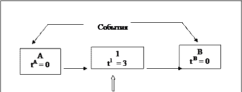 Построение сетевого графика типа " работы-связи" В таком формате для отображения трех элементов сетевого графика используют два символа: ~ Прямоугольник. Может обозначать как событие, так и работу. Чтобы их различать, внутри прямоугольников пишется продолжительность, обозначаемая символом " t". Если t = 0, то это событие. ~ Стрелки. Показывают связи между работами, определяющие порядок их выполнения. На рис. 3 приведен пример такого сетевого графика. После наступления события А (прямоугольник слева) можно начинать выполнять работу 1 (прямоугольник в середине). После завершения работы 1 наступает событие В (прямоугольник справа). Стрелками показывается только последовательность работ. В распространенном программном обеспечении по управлению проектами чаще применяется форма " работы-связи". Такая форма легче для понимания и чаще применяется распространенными программными пакетами по менеджменту.