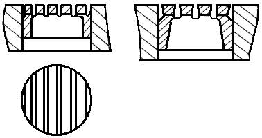 Толщина щели 0, 15-0, 30мм; Ширина 10-20мм; Длина щели 10-15мм Ширина канавки 4-4мм; Отверстия 2-3мм. Щели располагают между сквозными отверстиями. Таким образом, выходящий из ящика воздух делает два поворота под углом 900, что предупреждает выдувание смеси из гнезда ящика. Опробование такого ящика на машине нужно производить без щелей, соединяющих канавку с гнездом, и только если тех зазоров, которые практически всегда бывают по плоскости соединения ящика с надувной плитой, окажется недостаточно для своевременного прохода воздуха в канавку, следует выполнять предусмотренные щели. При изготовлении простых по форме стержней в открытых с двух сторон ящиках вентиляция осуществляется со стороны опорной (нижней) плоскости ящика. Для этого на стол машины устанавливается вентиляционная плита, имеющая на верхней плоскости нарезные вентиляционные канавки, через которые и удаляется воздух. Вместо прорезей в плите могут быть выполнены сквозные вентиляционные отверстия с установленными вентами. Венты – пробки пропускают воздух и удерживают смесь. Венты применяют нескольких конструкций. 1. Венты прорезные с прямыми канавками и прорезные с клинообразными канавками.