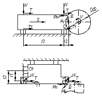 Отличительной особенностью методика проектирования УСП является отсутствие конструкторской части. Обычно, на практике, после проектной проработки, приспособление собирается на специальных участках из стандартных заранее изготовленных элементов и после проверки путем обработки пробных заготовок, поступает в производство. В расчетной части выполняются следующие этапы. 1. Сбор исходных данных, в которые входят операционный эскиз со схемой базирования, данные о материале заготовки, режущем инструменте, режимах резания. Сведения о рабочем органе станка, на который базируется данное приспособление. 2. Расчет сил резания выполняется по эмпирическим формулам, приведенным в справочной литературе. 3. Выбор схемы установки. Схема разрабатывается на основе теоретической схемы базирования и реализуется с помощью базовых, корпусных и установочных элементов. Следует учитывать, что в УСП допускается установка заготовок непосредственно на базовые и корпусные элементы, так как они изготавливаются из качественной стали и закаливаются на максимальную твердость. 4. Выбор конструкции и расчет зажимного механизма. В УСП в большей степени используются комбинированные зажимные механизмы, состоящие из рычажного и винтового, выполняющего роль силового привода. В механизированных УСП в основном применяются рычажные механизмы и Г-образные прихваты в комплекте с гидроцилиндром. 5. Выбор и расчет силового привода. В УСП применяются приводы с ручным зажимом, в основном, винтовые. Расчет их сводится к определению требуемого крутящего момента на винте по заданной величине усилия зажима. В УСПМ используются гидроцилиндры, которые могут встраиваться непосредственно в базовый элемент или в виде отдельных агрегатов, крепящихся к ним болтами. Расчетом по заданному усилию на штоке определяется величина давления масла, подаваемого в гидроцилиндр. 6. Расчет погрешности установки заготовки для приспособлений данного типа не выполняется, а ее величина оценивается по действительной точности при обработке партии заготовок. Для приспособлений УСП также не выполняется конструкторская часть, включающая разработку общего вида приспособления. Вопрос 7. Как определить момент закрепления заготовки на примере расчета УСП. Исходными данными для определения момента закрепления заготовки являются схема закрепления заготовки, включающая схему установки заготовки, разработанную на основе теоретической схемы базирования, и схему составляющих сил резания для наихудшего случая их расположения. Рассмотрим случай фрезерования плоской поверхности корпусной детали дисковой двухсторонней фрезой. Схема закрепления заготовки и схема составляющих сил резания для наихудшего случая их расположения представлены на рис. 1 и 2.