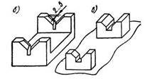 Установочные пальцы применяются при базировании заготовки по плоскости или торцам и отверстиям. ГОСТами определены следующие конструкции: 1. Пальцы установочные цилиндрические постоянные. 2. Пальцы установочные срезанные постоянные. 3. Пальцы установочные цилиндрические сменные. 4. Пальцы установочные срезанные сменные. 5. Пальцы установочные цилиндрические высокие. 6. Пальцы установочные срезанные высокие. Сменные пальцы применяются при интенсивной эксплуатации приспособления, когда они сравнительно быстро изнашиваются и заменяются. Опорные призмы. На рис. 4 показаны опорные призмы различных конструкций. Стандартная призма (ГОСТ 12195—66) применяется для установки коротких изделий (рис. 4, а) или как элемент опорной сборной призмы, предназначенной для базирования длинных изделий (рис. 4, в).