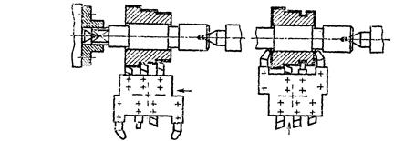 Обработку на настроенных станках ведут, точно устанавливая и фиксируя режущий инструмент. Положение заготовки в данной, предварительно настроенной технологической системе определяется приспособлением, а положение режущего инструмента - соответствующей частью станка (суппортом, шпинделем, револьверной головкой). Для ускорения установки и фиксации инструмента на станке применяют соответствующие приспособления. К простейшим устройствам этого типа относятся переходные втулки для инструмента на сверлильных станках, оправки для цилиндрических и дисковых фрез, расточные скалки, державки инструмента для револьверных станков. Многие из них нормализованы и стандартизованы. Часто применяют специальные приспособления. Так, при выполнении последовательных переходов на сверлильном станке целесообразно применять специальные патроны для смены инструментов без остановки шпинделя. Значительного повышения производительности достигают применением многошпиндельных сверлильных, резьбонарезных и фрезерных головок, устанавливаемых на универсальные одношпиндельные сверлильные и фрезерные станки, а также применением многорезцовых державок в универсальных токарных станках. Особую, многочисленную группу составляют приспособления, расширяющие технологические возможности металлорежущих станков. К ним относятся приспособления для протачивания кольцевых канавок и нарезания резьбы на вертикально-сверлильных станках, долбления шпоночных пазов на поперечно-строгальных станках, точения сферических поверхностей, а также “летучие” суппорты расточных станков для протачивания торцов, поворотные головки к фрезерным станкам и т.д. В связи с перспективой широкого развития многоинструментальных станков, переменно-поточных и автоматических (особенно переналаживаемых) линий большую значимость приобретают устройства для быстрой и точной установки режущего инструмента, блочная сменная наладка (многорезцовые суппорты, револьверные головки). Инструменты в таких наладках устанавливают и точно выверяют вне станка. Затем наладку с помощью центрирующих поясков, конусов или других элементов ставят на станок в точно ориентированное положение. При этом экономится много времени на смену инструментов и переналадку станка. Актуальна задача автоматической смены инструмента на станках-автоматах с ЧПУ. Ниже приведены примеры конструктивных и кинематических схем специальных приспособлений к станкам различного типа. Для сокращения времени обработки на токарных станках применяют специальные поворотные резцедержатели, несущие несколько инструментов. С помощью этих резцедержателей можновести одновременную обработку нескольких поверхностей (рис. 15), используя продольную или поперечную подачу суппорта. Предварительно настроив станок для работы по упорам, обеспечивают автоматическое получение размеров. В условиях серийного производства целесообразно иметь несколько сменных резцедержателей в зависимости от числа деталей, обрабатываемых на станке. Устройство для крепления режущего инструмента на токарно-револьверном станке (резцедержатели, расточные скалки, плашкодержатели, державки для крепления самоустанавливающихся разверток, суппорты для протачивания кольцевых канавок в отверстиях) в значительной степени нормализованы. 