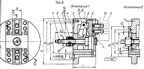 Эти патроны используются для закрепления несимметричных или фасонных деталей (арматура и т. п.) и обычно являются самоцентрирующими. Они выполняются ключевыми с ручным приводом, со спирально-реечным (тип А) и винтовым (тип Б) механизмами. Механизированные двухкулачковые патроны выполняются с клиновым центрирующим механизмом (ГОСТ 16866—71) или клино-рычажного типа (ГОСТ 16682—71) и работают от тяги привода, расположенного на заднем конце шпинделя станка. В заводской практике применяются механизированные двухкулачковые самоцентрирующие патроны и рычажного типа, различных собственных конструкций. Клино-рычажный двухкулачковый механизированный патрон по ГОСТ 16682—71 (рис. 52) удерживается от самоотвинчивания в процессе работы пружинным стопором 3, помещенным в гайке 2; последняя закреплена на винте 1 стопором 12. Винт 1 связывает патрон с тягой штока пневматического цилиндра и одновременно служит для регулирования положения кулачков. Доступ к винту возможен при отвинченной пробке. Кулачки 9 получают радиальное перемещение под действием рычагов 7, опирающихся на цилиндрические гнезда 6 в корпусе патрона 5. Штифты 8 предохраняют рычаги 7 от произвольного смещения. Давление поршня пневмоцилиндра передается рычагам посредством винта 1 и передней части муфты 4, имеющей две наклонные плоскости К, под действием которых при обратном хода поршня (слева направо) кулачки расходятся, освобождая обрабатываемую деталь. К кулачкам, имеющим рифления, крепятся сменные губки 11 с помощью винтов 10. Схема патрона, изображенная на рис. 2, не определяет его конструкцию.