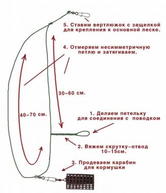 Эти оснастки очень похожи при изготовлении, разница заключается лишь в пропорции плеч самой петли. Наверное, все наслышаны про высокую чувствительность фидерной снасти при использовании «несимметрии». Многие именно из-за этого отдают предпочтение этой оснастке, хотя и приходиться затрачивать время на ее вязку, причем на первых порах освоения ловли на фидер, это время может быть и не малым. Но что может сравниться с практически стопроцентной передачей даже малейшей поклевки на кончик фидера? Но на течении петлевая оснастка может и совсем не радовать рыболова. Многие отказались от петли именно из-за частых перехлестов поводка. Те рыболовы, которые «подружились» с такой оснасткой, с удивлением слышат о перехлестах и запутывании снасти. Как всегда – сколько людей столько и мнений. Но факт остается фактом – на течении, да еще и на сильном, перехлесты случаются чаще, особенно если заброс не стопорится клипсой катушки. Причем у некоторых рыболовов именно несимметричная петля больше запутывается и отводящий поводок у нее быстрее теряет свои «отводящие» свойства. Почему это происходит – не знаю, но симметричная петля, несмотря на свою схожесть с «несиметрией», бывает, показывает более лучшие качества на течении. Деформация отводящего поводка у нее происходит медленнее, соответственно и запутывания поводка реже. Но опять же, это личный опыт каждого и многое зависит от особенности дна реки и течения. Несимметричная петля на фидере, покажет поклёвку при потягивании насадки рыбой практически в любую сторону, и если с перехлестами проблем нет, то не имеет смысла ограничивать себя в чувствительности снасти, используя патерностер или симметричную петлю. При ловле небольшой рыбы и вялом клёве именно чувствительность оснастки может сыграть важную роль.