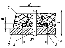 1 - модель, 2 - плита модельна, 3 - штир, 4 - пластина, 5 - шуруп Рисунок 5.13 - Фіксація моделей штирями Таблиця 5.13 – Розміри штирового фіксатора, мм