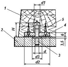 1 - модель, 2 - плита модельна, 3 - гвинт, 4 - гайка, 5 - шайба Рисунок 5.14 - Кріплення моделей гвинтами Таблиця 5.14 – Розміри гвинтового кріплення