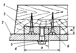 1 - модель, 2 - плита модельна, 3 - пластина, 4 - болт, 5 - шайба, 6 - шуруп Рисунок 5.16 - Кріплення моделей пластинами Таблиця 5.16 -Розміри кріплення пластинами