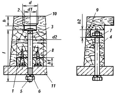 а б а - кріплення моделі гвинтом, б - кріплення моделі болтом, 1 - пластина, 2 - пробка, 3 - гвинт, 4 - болт, 5 - гайка, 6, 7 - шайба, 8 - шуруп, 9 - заглушка, 10 - модель, 11 - плита модельна Рисунок 5.17 - Кріплення моделей гвинтами і болтами Таблиця 5.17 - Розміри кріплення гвинтами і болтами, мм