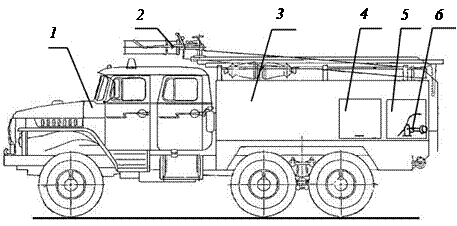 Рис. 8.1. Автоцистерна пожарная АЦП-6/6-40(Урал-5557-10): 1 – шасси автомобиля Урал; 2 – ствол лафетный; 3 – цистерна; 4 – отсек размещения ПТВ; 5 – насосный отсек; 6 – насосная установка