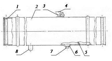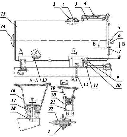 Рис. 8.2. Цистерна: 1, 4 – крышки; 2 – контрольная труба; 3 – горловина; 5 – кронштейн; 6 – труба; На верхней части цистерны имеется горловина 3. Она обеспечивает доступ внутрь цистерны для ее осмотра и ремонта. Горловина закрывается крышкой 4 с резиновым уплотнением. В днище имеется отстойник 9. Слив отстоя производится через кран 11, который открывается с помощью рычага 10. Забор воды осуществляется по трубе 8. На заднем днище цистерны на кронштейне 5 установлен тахометр. Штуцер 7 и труба 6 служат для подсоединения водопенных коммуникаций. В переднем днище имеется горловина горизонтального люка 14. Для уменьшения силы удара жидкости о стенки цистерны при изменении скорости движения автомобиля установлены волноломы. Для измерения уровня заполнения цистерны водой установлены гидроконтакты 22.