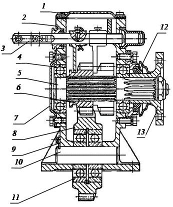 В карданных передачах используется от одного до трех карданных валов базового шасси, соединяемых промежуточными опорами. Коробка отбора мощности, промежуточные опоры и редукторы специально разработаны для автоцистерн. Коробки отбора мощности (КОМ). Они, как правило, механические, одноступенчатые. КОМ АЦ на шасси ГАЗ установлена на боковом люке раздаточной коробки. От КОМ крутящий момент передается на насос через два карданных вала, соединенных промежуточной опорой. Ее конструкция представлена на рис. 8.6. Промежуточная шестерня 8 находится в постоянном зацеплении с шестерней первичного вала раздаточной коробки. Шестерня 8 вращается на двух подшипниках 11, закрепленных на оси 10. Ось фиксируется стопорной пластиной 9. На шлицах вала 5 может с помощью штока 3 перемещаться шестерня 6. При таком ее положении, как показано на рисунке, мощность будет передаваться на фланец 13 соединительной муфты. Передний конец штока 3 соединен тягой с рычагом включения, который находится в кабине. Перед включением пожарного насоса рычаг раздаточной коробки необходимо поставить в нейтральное положение и включить прямую передачу на коробке передач. На крышке люка 1 смонтирован змеевик (на рисунке не показан) для охлаждения коробки отбора мощности во время ее работы на пожарном насосе. Змеевик включен в дополнительную систему охлаждения АЦ. Охлаждение осуществляется водой из пожарного насоса.