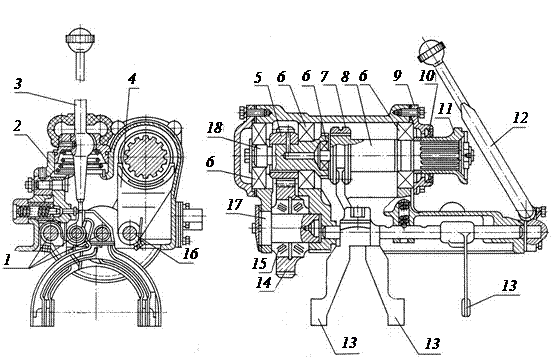 Рис. 8.7. КОМ автомобиля на шасси ГАЗ: 1 – ведущий вал с муфтой; 2 – зубчатое колесо; 3 – ось; 4 – промежуточное зубчатое колесо; 5 – ведомые шестерни к потребителю энергии; 6 – ведомый вал с муфтой; Конструкция КОМ, установленных на ряде пожарных автомобилей, имеет некоторые особенности (рис. 8.7). Ведущий вал 1 соединен с первичным валом коробки передач. На нем закреплена шестерня 10, на которой находится зубчатая муфта 7. На роликовом подшипнике установлено зубчатое колесо 2. С ним в зацеплении постоянно находятся зубчатые колеса 4 и 5. В положении, указанном на рисунке, КОМ выключена. При перемещении штока 11 механизма управления в левую сторону ведущая зубчатая муфта 7 будет соединена с зубчатым колесом 2. Таким образом, крутящий момент будет передаваться зубчатыми колесами 4 и 5 к ведомому валу 6 с муфтой к потребителю. При перемещении штока 11 в правую сторону зубчатая муфта 7 соединит зубчатые колеса 10 и 8. При этом вращающий момент будет подведен к ведущему валу 9 с муфтой и к трансмиссии автомобиля. Охлаждение КОМ осуществляется водой от пожарного насоса, подводимой к теплообменнику 12, установленному в масляной ванне. В некоторых конструкциях АЦ-0, 8-30/2(530104) теплообменник в виде радиатора устанавливают на коробке передач, к которой присоединены КОМ. Теплообменник и коробка передач разделены разделительной ребристой перегородкой. Нагретое масло в коробке передач постоянно отбрасывается вращающимися шестернями на охлажденную перегородку радиатора и тем самым снижает его температуру. КОМ АЦ на шасси ЗИЛ. Механическая, одноступенчатая с передаточным числом 1, 176 (рис. 8.8). Детали КОМ заключены в чугунный корпус 2. Он же является крышкой коробки передач. Включение требуемой передачи производится перемещением вилок переключения 13 на штоках 1 рычагом 3. Основные детали КОМ: ось 17, промежуточная шестерня 14, ведомая шестерня 5, первичный вал 18 и вторичный вал 8, зубчатая муфта 7, подшипники 6, сальник 10, фланцевая муфта 11. Ось 17 закреплена в корпусе КОМ. На ней на роликовых конических подшипниках установлена промежуточная шестерня 14. Она находится в постоянном зацеплении с шестерней ведущего вала 18 шестерней коробки передач. Осевой зазор в конических роликовых подшипниках должен находиться в пределах 0, 04 – 0, 11 мм. Его измеряют индикатором по осевому люфту промежуточной шестерни 14. Устанавливается требуемый зазор с помощью картонных прокладок под фланец, крепящий ось. Ведомая шестерня 5 с помощью шпонки закреплена на первичном валу 18. В шестерне имеется радиальное отверстие, совмещенное с отверстиями в теле вала. По ним подводится масло к подшипнику. Масло выдавливается при контакте боковых поверхностей зубьев промежуточной 14 и ведомой 5 шестернями.