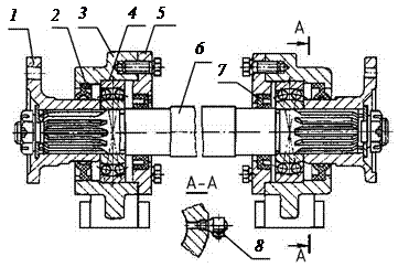 Рис. 8.10. Промежуточная опора с длинным валом: 1 – муфта фланца; 2, 7 – сальники; 3 – корпус подшипника; 4 – подшипник; 5 – крышка; 6 – вал; 7 – манжета; 8 – масленка