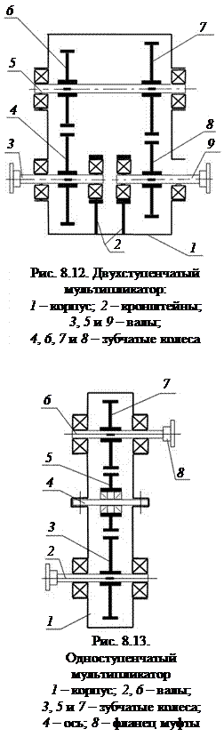 Дополнительные зубчатые передачи. Дополнительные передачи применяются только на АЦ, сооружаемых на шасси КамАЗ. На АЦ с пожарными насосами ПЦНВ 4/400 для повышения частоты вращения вала насоса применяется двухступенчатый мультипликатор, изображенный на рис. 8.12. В корпусе 1 установлены два кронштейна 2 шариковых подшипников качения. На этих подшипниках и таких же подшипниках, установленных в корпусе 1, размещены валы 3 и 9 с фланцами муфт. С валом 3 соединяется карданный вал от КОМ, а с валом 9 – вал пожарного насоса. Зубчатые колеса на валах закреплены шпонками. На валу 5 установлены два зубчатых колеса 6 и 7. Каждая пара зубчатых колес имеет передаточное отношение, близкое к 1, 7. Это позволяет повышать обороты вала насоса до