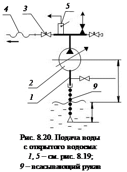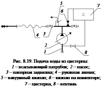 создав насосом заданный напор, открыть задвижку 3 на напорном трубопроводе; поддерживать требуемый напор изменением частоты вращения вала двигателя. При заборе воды из цистерны на АЦ с насосами ПЦНН и ПЦНВ перед пуском насосов следует закрыть вакуумный кран, а вакуумный насос вручную отключить от пожарного насоса. При этом рукоятка дозатора должна находиться в положении «Закрыто». Подача воды пожарным насосом из открытого водоема. Работа по подаче воды пожарными автоцистернами и насосно-рукавными автомобилями из открытых водоисточников производится в ряде случаев. Это имеет место в населенных пунктах со слабо развитой сетью водоснабжения, в сельской местности, а также в случаях, когда для тушения пожара требуется большое количество воды. Например, при тушении горящей нефти и нефтепродуктов в резервуарах или пожаров газовых и нефтяных фонтанов воду обычно подают из открытых естественных или искусственных водоемов. Подготовка к подаче воды производится в следующей последовательности (рис. 8.20): извлекают из пеналов всасывающие рукава, соединяют их друг с другом и подсоединяют всасывающую сетку; снимают заглушку со всасывающего патрубка 1 и подсоединяют к нему всасывающие рукава 9 с сеткой;