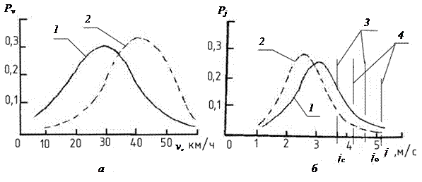 Рис. 8.28. Скорости (а) и поперечное ускорение центра масс (б): 1 – АЦ-40 (130) 63Б; 2 – АПП; 3 – скольжение; 4 – отрыв колес