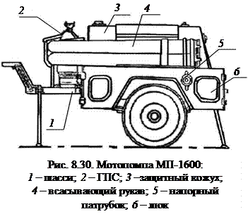 Мотопомпы – это транспортируемые средства, предназначенные для подачи воды из водоисточника к месту тушения пожара. Они представляют собой автономный агрегат, состоящий из центробежного насоса и двигателя внутреннего сгорания. Автономность, сравнительно небольшая масса делают их незаменимыми в пожарной охране сельской местности, организации подачи воды из труднодоступных для АЦ мест. Имеются различные модификации мотопомп: для работы на морской воде, для перекачки различных жидкостей. Они могут использоваться и для пожаротушения. Мотопомпы могут устанавливаться на автоцистернах и пожарных автомобилях первой помощи, что позволяет, при отсутствии удобного подъезда к водоисточнику, установить на нем мотопомпу и организовать работу по перекачке воды. По тактическому назначению и способу транспортировки мотопомпы делятся на два типа: переносные и прицепные. Мотопомпы переносные монтируют на легких рамах. К месту пожара их доставляют транспортными средствами или подносят к водоисточнику вручную. Мотопомпы прицепные оборудуют на одноосных прицепах. Их буксирует любой автомобиль с буксирным устройством. Мотопомпа прицепная МП-1600 (рис. 8.30). Ее монтируют на одноосном прицепе. Она состоит из двигателя внутреннего сгорания и центробежного насоса. Двигатель четырехцилиндровый карбюраторный тип ЗМЗ-24-01. При частоте вращения коленчатого вала n = 4500 об/мин он развивает мощность 62, 5 кВт. Это двигатель автомобиля, а так как на мотопомпе он эксплуатируется в стационарном режиме, то для охлаждения он оборудован теплообменником. Вода, поступающая в теплообменник из центробежного насоса, предотвращает перегрев двигателя. Теплообменник установлен на головке блока цилиндров вместо верхнего патрубка.