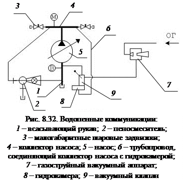 Система водопенных коммуникаций простая (рис. 8.32). Она обеспечивает забор воды из естественных и искусственных водоисточников с глубины до 7 м. В системе имеется пеносмеситель 2 со штуцером. К этому штуцеру подсоединяется емкость с пенообразователем. При помощи пеногенератора ГПС-600, подсоединяемого к патрубку коллектора 4, при открытой шаровой задвижке 3 возможно тушение пожара пеной.