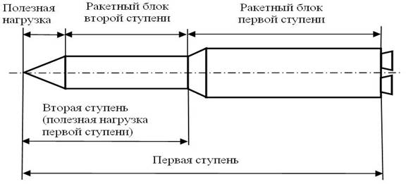 ОСНОВНЫЕ ПОЛОЖЕНИЯ Структура многоступенчатой ракеты В настоящее время для запусков космических объектов используются многоступенчатые ракеты-носители. Структуру ракеты-носителя рассмотрим на примере двухступенчатой ракеты. Двухступенчатая ракета состоит из полезной нагрузки, ракетного блока (ускорителя) второй ступени и ракетного блока (ускорителя) первой ступени, как это показано на рис. 1.