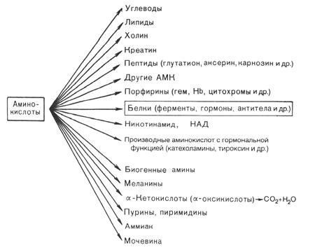 Рис. 16. Пути использования аминокислот в тканях организма животных.