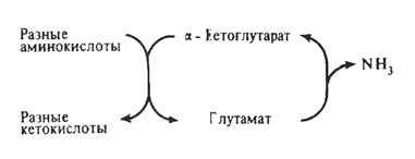 Рис. 18. Связь процессов трансаминирования и дезаминирования через a-кетоглутаровую и глутаминовую кислоты.