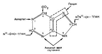 Из схемы на рис.22 видно, что 4-й и 5-й атомы углерода и 7-й атом азота в ядреобразуются из глицина. Два атома азота (N-3 и N-9) происходят из амидной группы глутамина, один атом азота аспарагиновой кислоты; углеродный атом (С-2) происходит из углерода формил-