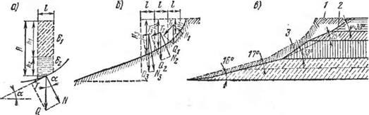 Выделенная призма (см. рис.а) стремится сместиться по поверхности обрушения под действием касательной составляющей силы веса: Т=Q*sin∝ Силы сопротивления сдвигу слагаются из сил внутреннего трения и сцепления, которые равны: Q*cos∝ *tgφ +c*(1/cos∝) где с — сцепление; φ — угол внутрен. трения. Условия предельного равновесия, соответствующие равенству сдвигающих и удерживающих сил, выразятся зависимостью Q*sin∝ = Q*cos∝ *tgφ +c*(1/cos∝) Деля обе части равенства на Q*cos∝ и учитывая, что Q=l*h*δ, где δ — плотность грунта, получаем tg∝ =tgφ +c/(δ /2cos2∝) Полученная зависимость показывает, что верхняя часть откосов в связных грунтах может быть устойчива при большой крутизне, а в нижней части высокие откосы должны быть пологими, с углом наклона, приближающимся к углу внутреннего трения (см. рис. б). Метод исходит из предпосылок, что в момент обрушения в грунте действует гидростатическое распределение давления (коэфициент бокового давления ε = 1), а угол устойчивости откоса для любого грунта равен углу сдвига φ при давлении на грунт р, т. е. Tg Для построения профиля устойчивого откоса (см. рис. XIV. 17, е) выделяют по высоте ряд слоев в соответствии со слагающими его напластованиями; для подошвы каждого из них определяют давление от собственного веса грунта: Ph=∑ δ h Величины расчетных углов сдвига находят по выражению Tg𝛙 =1/K3(tgφ +c/p) где К3 — необходимый коэффициент запаса При К3 = 1 получается очертание откоса в состоянии предельного равновесия. Очертание откоса назначают в соответствии с найденными величинами ф, начиная с подошвы откоса. Для приближения формы откоса к очертанию устойчивого откоса применяют переменную крутизну его на разных участках по высоте или, сохраняя постоянную крутизну, вводят бермы (рис. XIV. 18). Бермы уменьшают скорость стекания по откосу дождевых и талых вод, предотвращая его размывание. Они облегчают также ремонт и содержание откосов, позволяя осматривать их, подвозить и складывать материалы для ремонта.