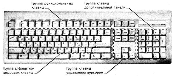 Рисунок 17 − Группы клавиш стандартной клавиатуры Используется стандартная – 101, 102, 104, 105 или 108-клавишная под Windows. Клавиатура компьютера может работать в одном из нескольких режимов, которые принято называть регистрами. Различают следующие режимы: · ввода прописных (заглавных, больших) или сточных (маленьких) букв; · ввода русских или латинских букв (раскладка клавиатуры); · вставки или замены; · цифрового ввода или управления из цифровой клавиатуры. Все клавиши клавиатуры можно разделить на четыре группы – алфавитно-цифровые, цифровые, функциональные и управляющие. Клавиши алфавитно-цифровой группы служат для ввода первичной текстовой информации. Цифровая группа находится на правом участке клавиатуры. Клавиши этой группы удобно использовать для ввода больших массивов числовой Группа функциональных клавиш включает двенадцать клавиш (от F1 до F12), размещённых в верхней части клавиатуры. Функции, закреплённые за данными клавишами, зависят от свойств конкретной работающей в данный момент программы, а в некоторых случаях и от свойств операционной системы. Общепринятым для большинства программ является соглашение о том, что клавиша F1 вызывает справочную систему, а для выхода из программы F12. Среди функциональных клавиш есть такие, которые выполняют одинаковые функции в любой программе. В зависимости от используемой программы значения клавиш могут меняться. F1 — традиционная клавиша «Помощь». При её нажатии на экран во время работы практически любой программы будет выведён краткий справочник по её основным функциям. Enter — ввод — нажатие этой клавиши даёт указание выполнить какую-либо из выбранных команд. В режиме набора текста — переход на следующий абзац, аналогичный «переводу каретки» на пишущей машинке. Esc — (от Escape — отменить) — прекратить выполнение операции. Caps Lock — включить режим большой буквы. При нажатой клавише весь печатаемый вами текст будет набираться ПРОПИСНЫМИ БУКВАМИ. Shift — при работе в текстовом режиме нажатие этой клавиши одновременно с буквенной выдаст вам большую, прописную букву. Page Up — «пролистывание» изображения вверх. Page Down — «пролистывание» изображения вниз. Backspace — удаление последнего символа, в Проводнике Windows используется для перехода в папку более высокого уровня. Del — клавиша удаления выделенного текста, файла и т. д. Ins — команда, противоположная Delete. Клавиша вставки и создания. Tab — вставка табуляции (отступа до заранее заданной позиции). В Windows используется для переключения между элементами окна без помощи мышки. PrintScreen — эта кнопка позволяет сделать «снимок» с экрана компьютера, помещая его в «буфер обмена». В дальнейшем можно сохранить его с помощью любого графического редактора в виде файла. Последнюю, четвёртую группу образуют клавиши управления. Они размещены по периметру алфавитно-цифровой группы, а также между алфавитно-цифровой и цифровой группами. Windows-клавиши. Большинство современных клавиатур снабжены тремя специальными кнопками, предназначенными для работы в операционной системе Windows, расположенными в нижней части клавиатуры, рядом с кнопками Ctrl и Alt. Кнопки с изображением логотипа Windows — летящего окна — служат для быстрого вызова меню Пуск, третья клавиша отвечает за вызов «контекстного меню», дублируя правую клавишу мышки. Дополнительные клавиши. На некоторых новых мод