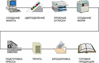 Он состоит из длинной цепочки взаимосвязанных этапов. До недавнего времени каждый этап выполнял профессионал узкой специализации. Появление настольных издательских систем (Desktop Publishing = DTP) способствовало стиранию граней между отдельными этапами подготовки изданий.