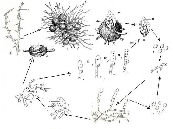 Рис. 17. Жизненный цикл сумчатых грибов на примере сферотеки крыжовника (Sphaerotheca mors-uvae) (По: Рейвн, Эверт, Айкхорн, 1990, с дополнениями по: Гордеева, 1953). 1 – сумкоспоры, 2 – сумкоспора, проросшая гифой и формирующийся мицелий; 3 – развитый септированный мицелий на поверхности листа с конидиальным спороношением; 4 – конидиоспоры, переносимые ветром на другие органы; 5 – формирование органов полового размножения на мицелии к концу периода вегетации: а – аскогон, б – антеридий; 6 – оплодотворенный в результате плазмогамии аскогон (б) и формирующиеся аскогенные гифы (а); 7 – формирование сумки по способу крючка: а – средняя клетка крючка (место перегиба) с двумя несестринскими ядрами, б – молодая сумка с 2п ядром после кариогамии; в – сумка с 4-мя гаплоидными ядрами после мейоза; г – сумка с 8 гаплоидными ядрами; 8 – зрелая сумка с 8 сумкоспорами; 9 – пораженный мучнистой росой побег крыжовника: а – усыхающие концы ветвей; 10 – пораженная ягода (на поверхности виден налет мицелия с клейстотециями черного цвета; 11 – вид мицелия с клейстотециями при малом увеличении микроскопа: а – клейстотеции с гифообразными придатками; 12 – отдельный раскрывшийся клейстотеций и выходящая из него сумка со спорами (а). Буквенные обозначения над стрелочками: П – плазмогамия; К – кариогамия; М! – мейоз, ф.с. – формирование сумкоспор