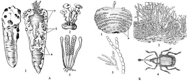 Рис. 21. Грибы из порядка Helotiales (по: Курс низших растений, 1981, Хохряков, 1969, Гарибова, Лекомцева, 2005). А – Sclerotinia sclerotiorum: 1 – белая гниль на моркови: а – ватообразный мицелий, б – склероции гриба, в – непораженные участки, 2 – склероций, прорастающий апотециями, 3 – сумки с сумкоспорами; Б – Monilinia fructigena: 1 – пораженный плод яблони с конидиальным спороношением гриба: а – подушечки конидиального спороношения, 2 – подушечка конидиального спороношения при малом увеличении микроскопа, 3 – отдельные конидиеносцы с цепочками конидий, 4 – жук-казарка – переносчик спор монилинии