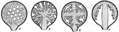 Рис. 36. Типы глебы гастеромицетов (по: Курс низних растений, 1981). А – лакунарный; Б– кораллоидный; В– многошляпочный; Г– одношляпочный